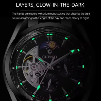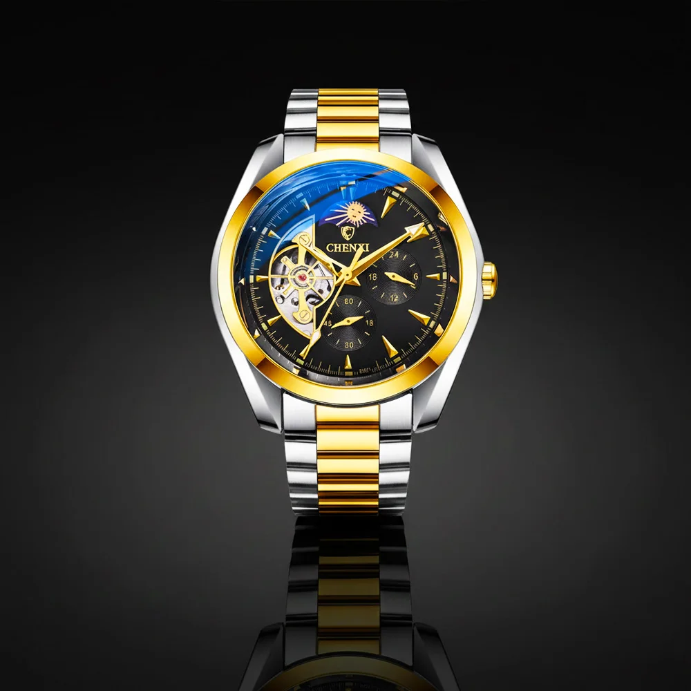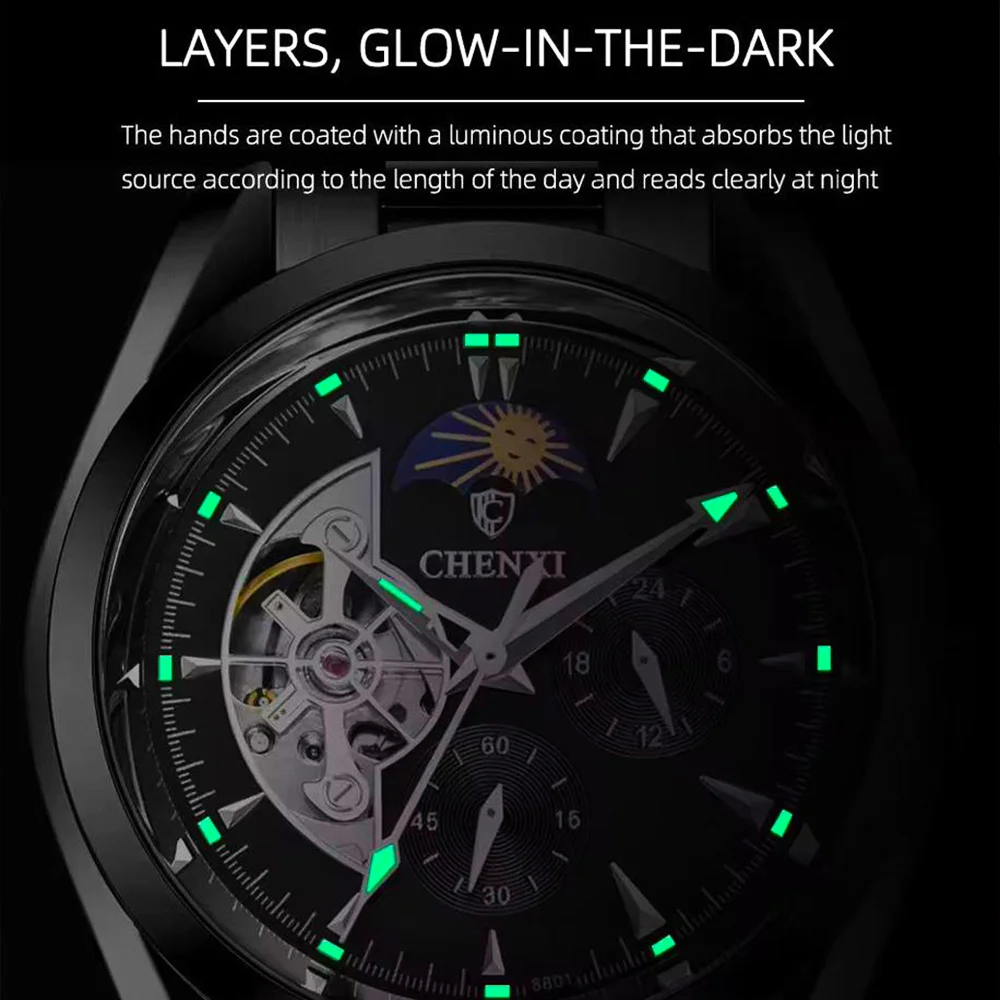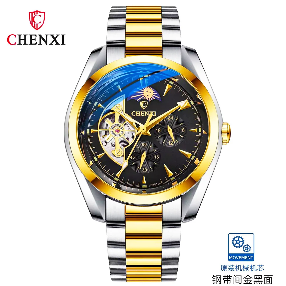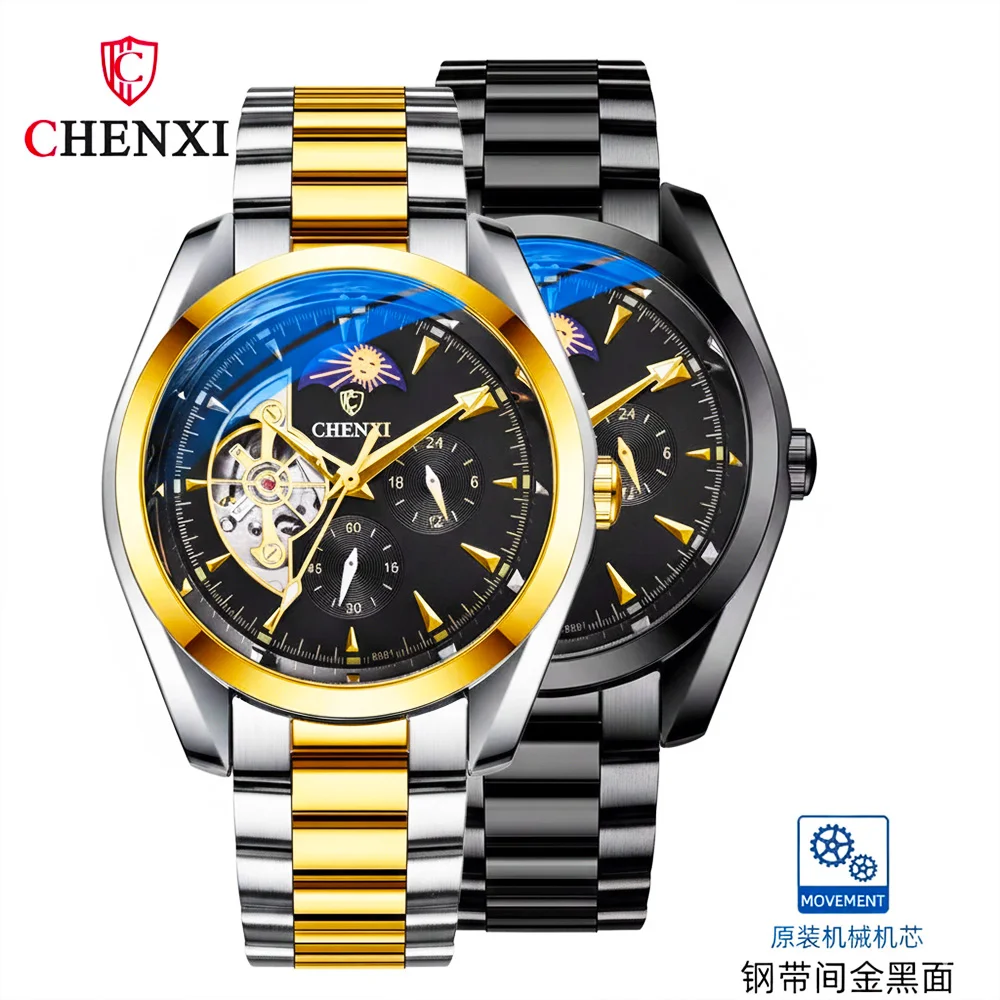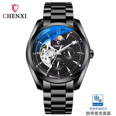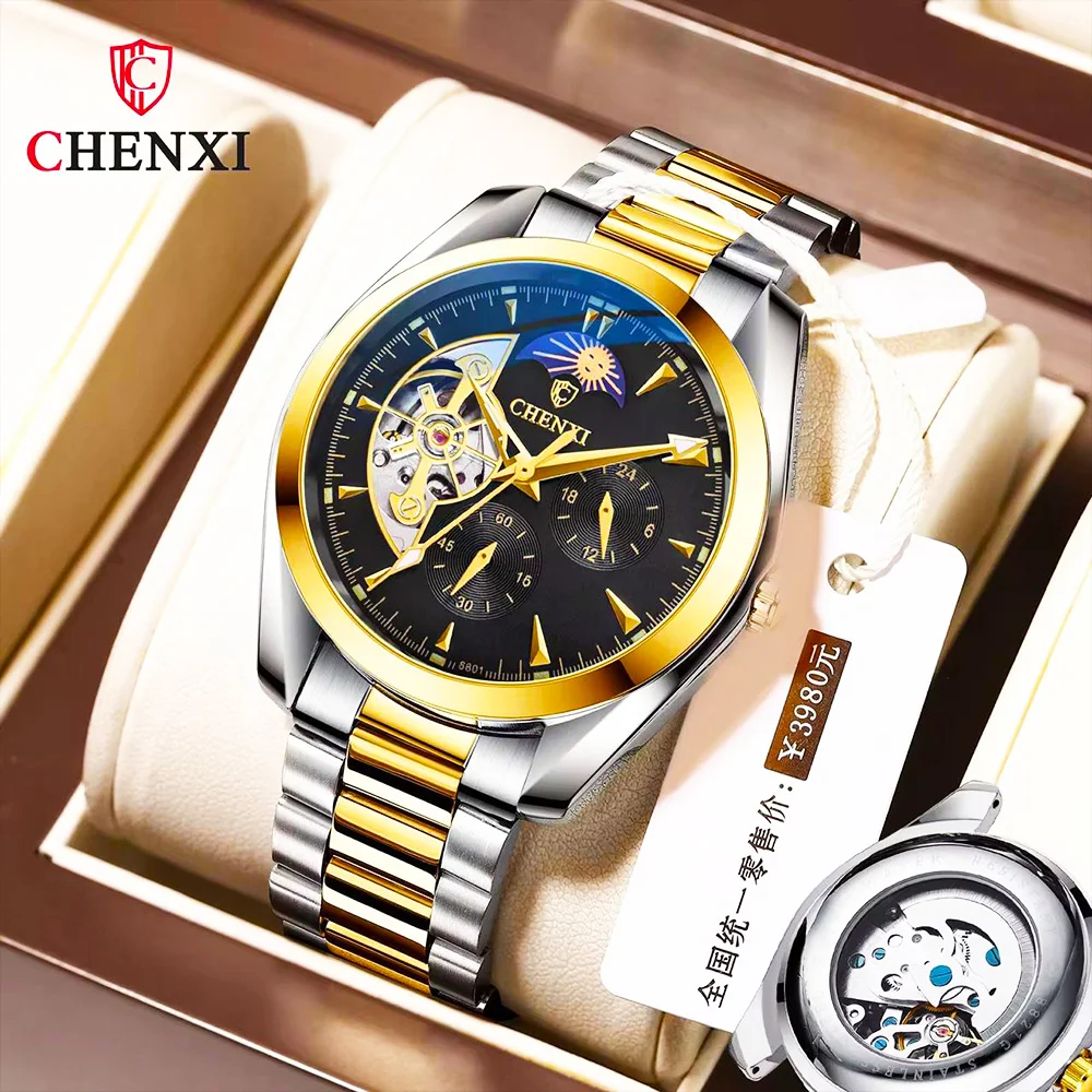 An original CHENXI automatic watch with open-heart (tourbillon-style) design, working chronograph-style subdials, moonphase display, and skeleton back — feature-rich, visual, and value-focused.