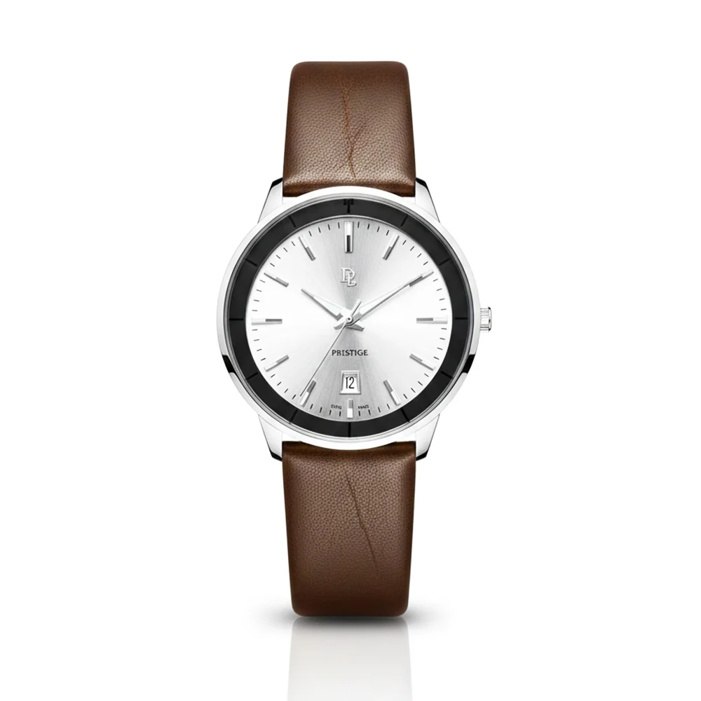 It features a Japan quartz movement, known for accuracy and long life, along with a date working function for daily practicality. The leather strap with brand lock provides comfort and a classic look, making it suitable for office, casual, and semi-formal wear.