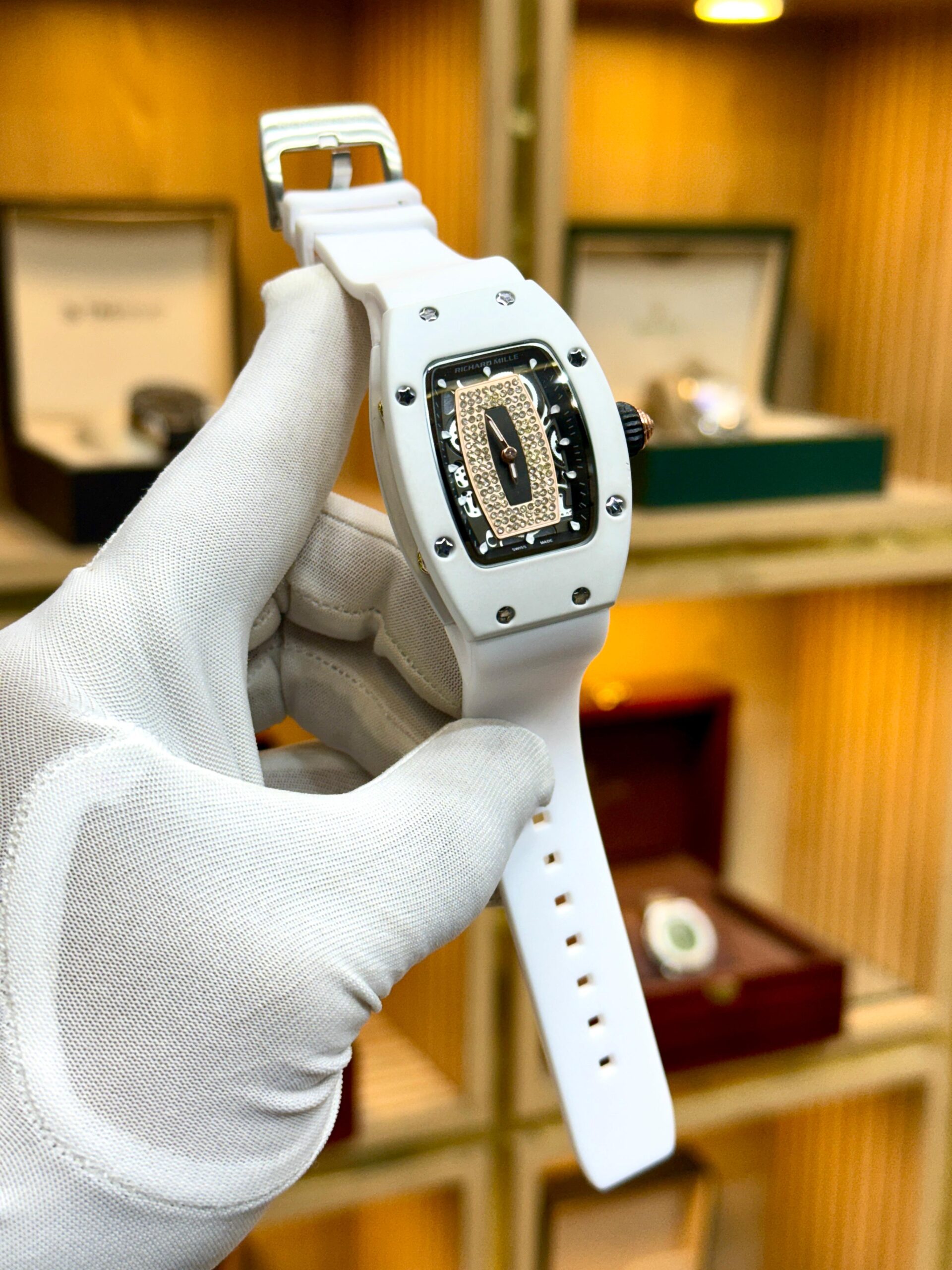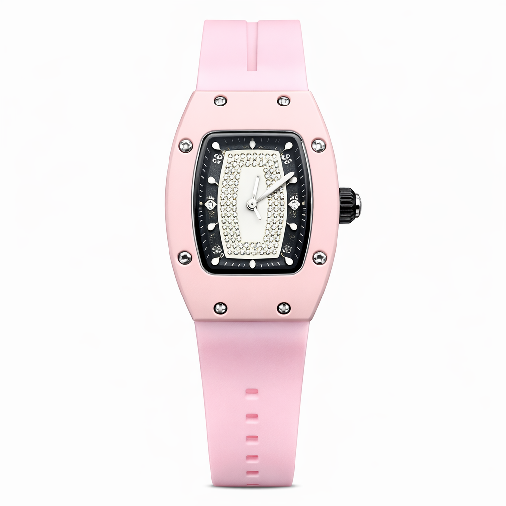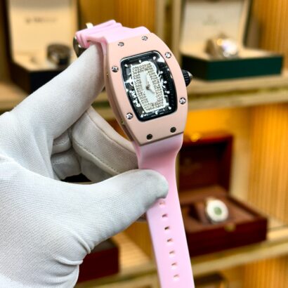 An RM-style women’s watch with quartz movement, rubber strap, and simple lock — sporty look, comfortable fit, everyday reliability.