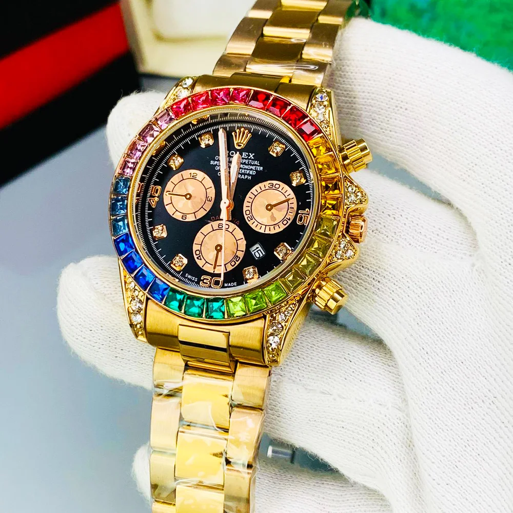 Clearly original Rolex nahi hai, but rainbow stones ka look bohat flashy hai. Party wear ke liye perfect statement watch.