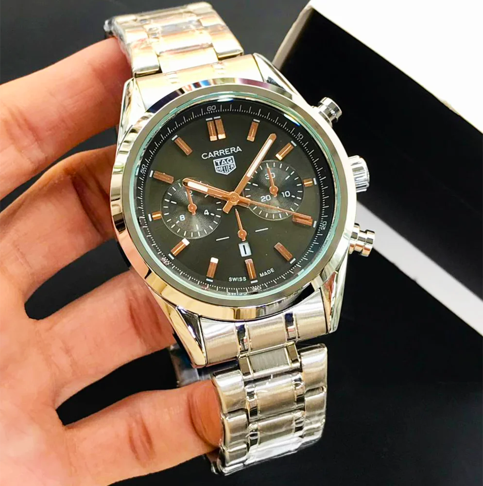 Sporty TAG Heuer Carrera-style men’s watch with heavy build, quartz movement, date function, and stainless steel chain — made for bold daily and formal wear.