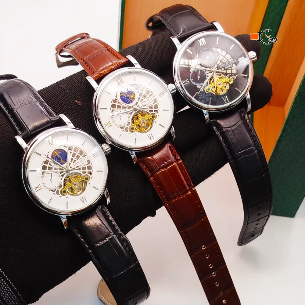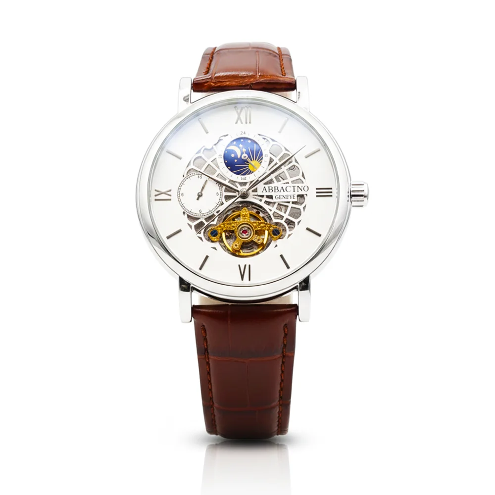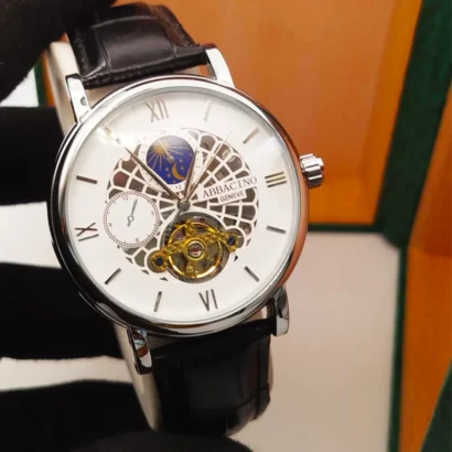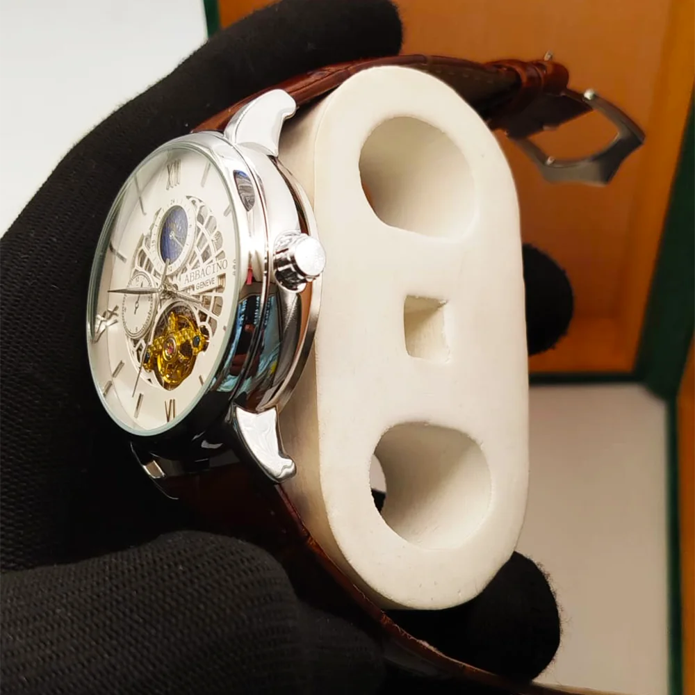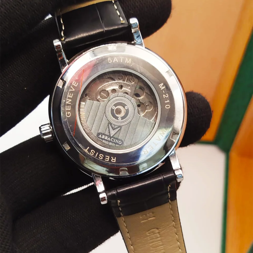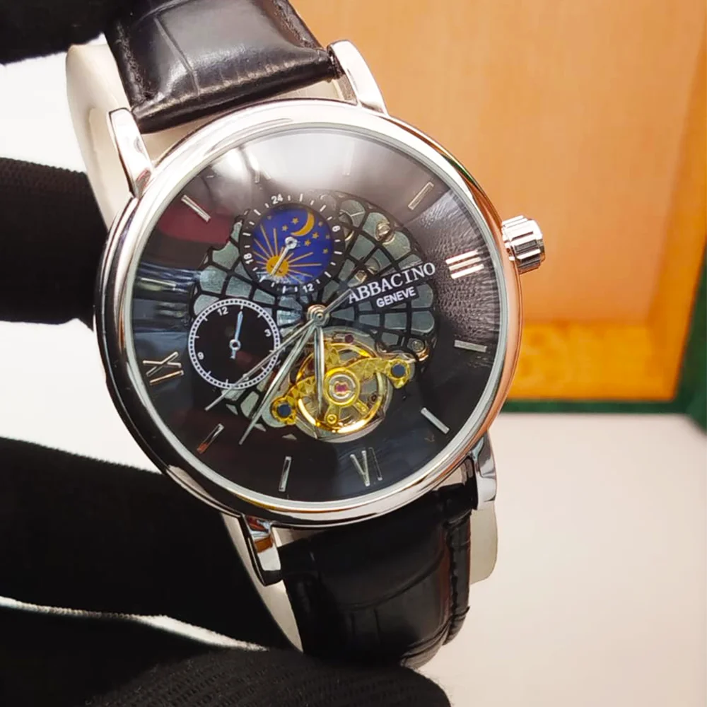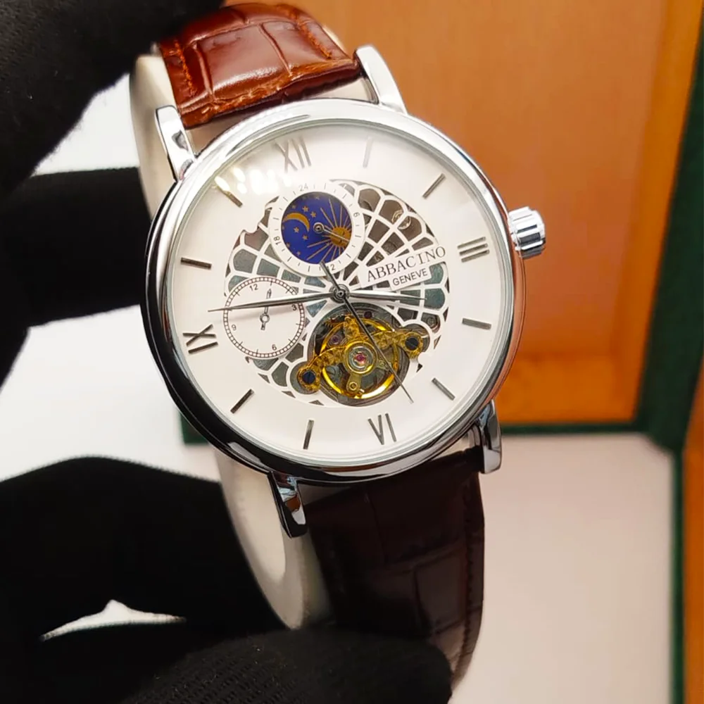Elegant ABBACINO automatic watch with working moon graph, functional pendulum, skeleton back, and genuine leather strap. A premium men’s timepiece with mechanical charm.