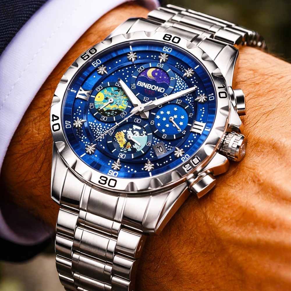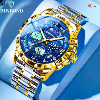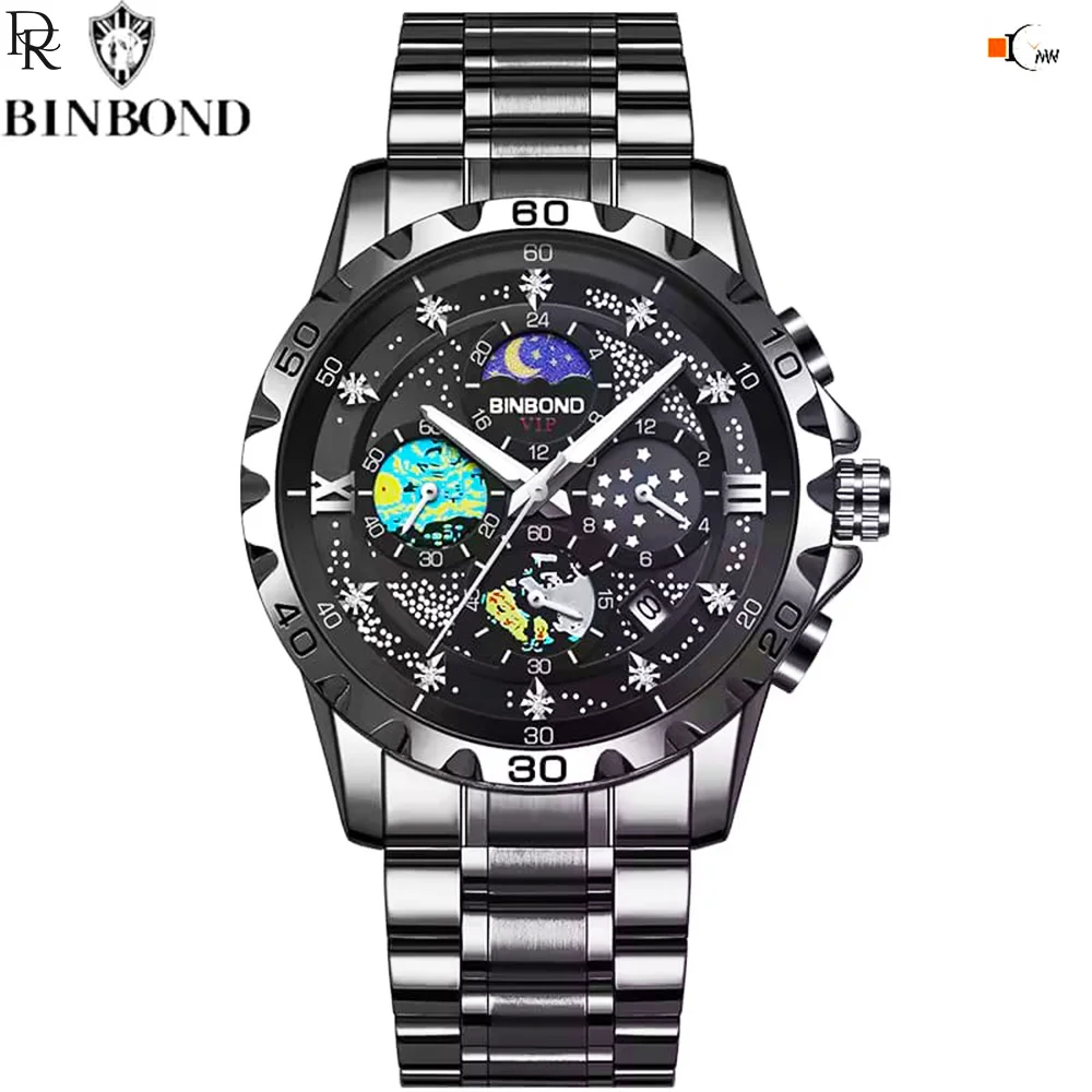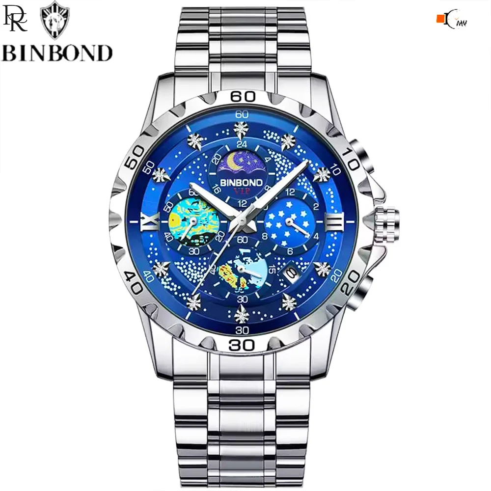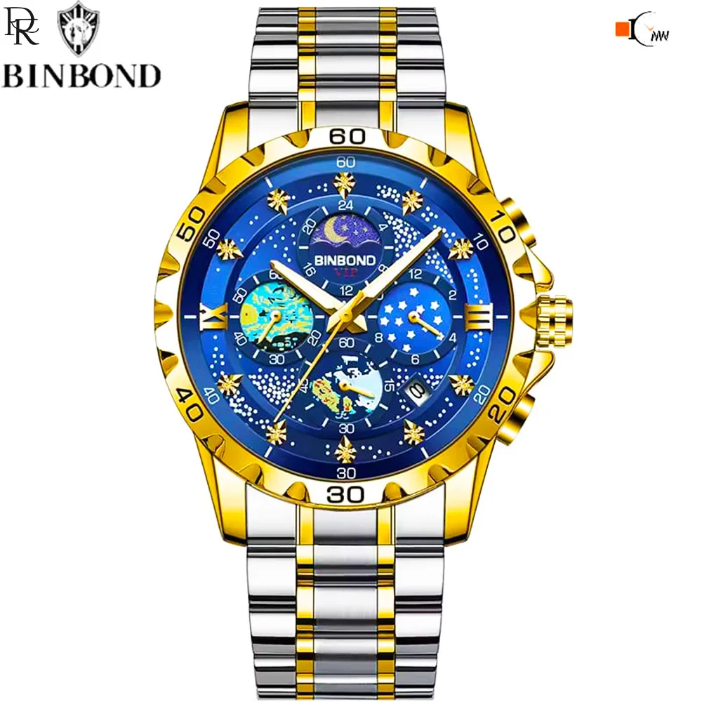 BINBOND original chronograph watch with full working dials, moon graph, and butterfly lock. Sporty design with premium finishing — limited stock!