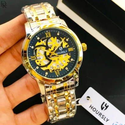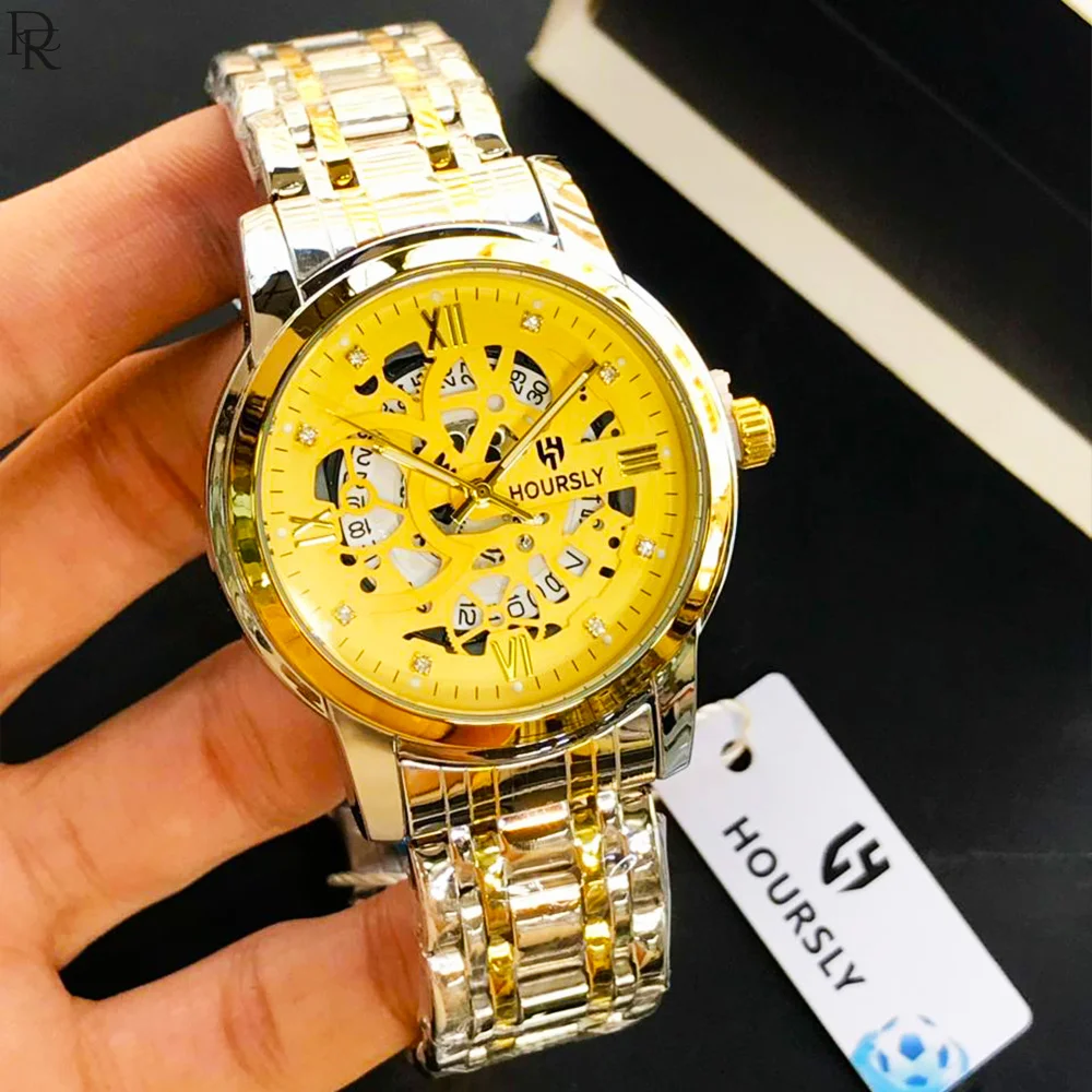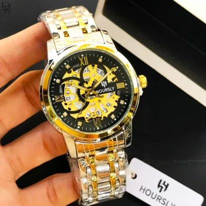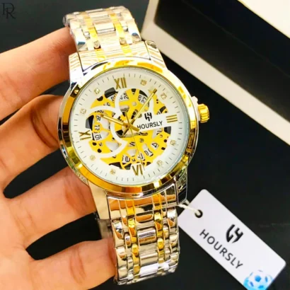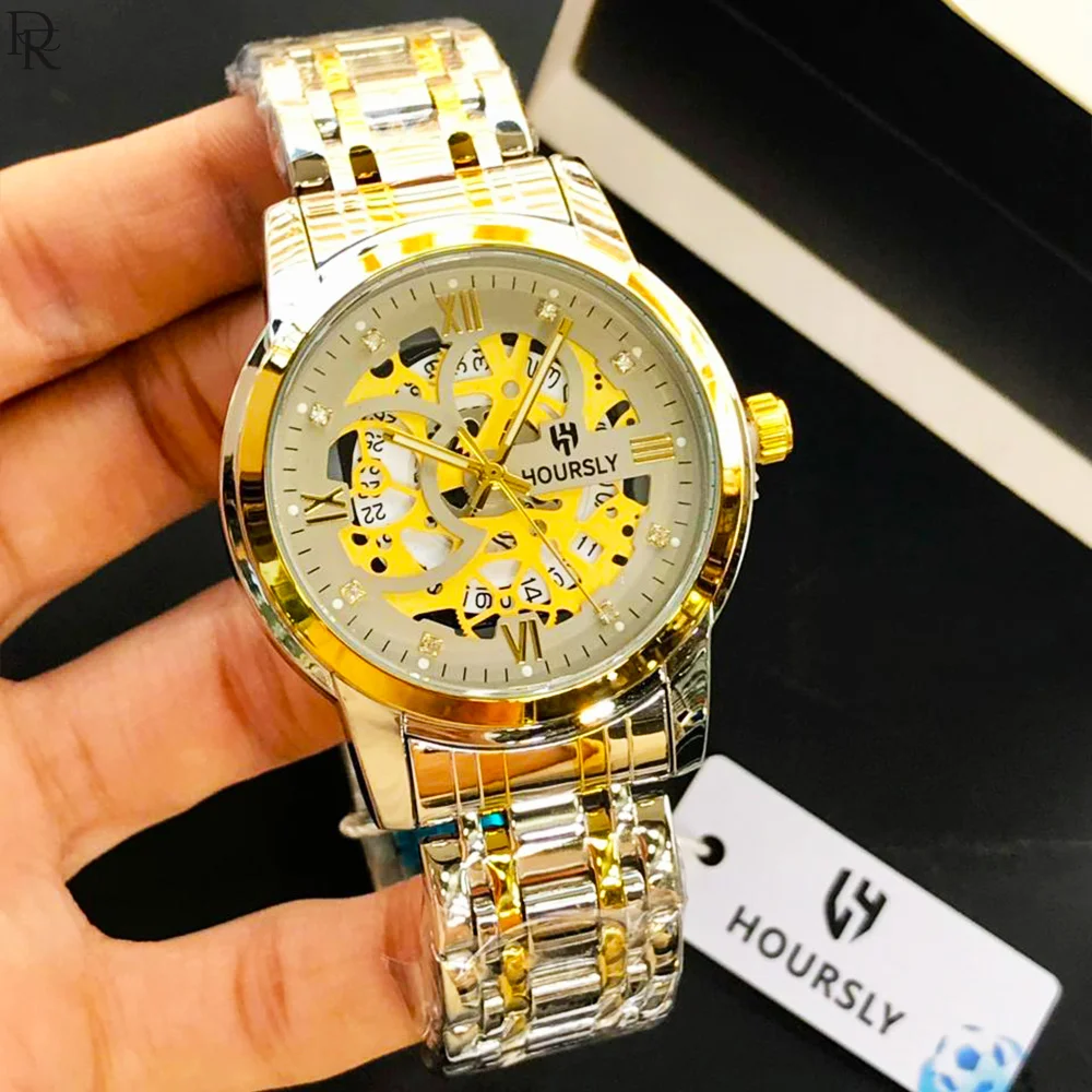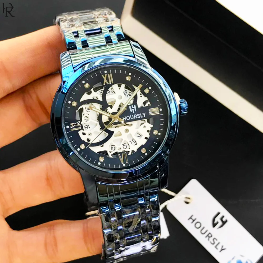 New HOURSLY model with stylish skeleton dial, quartz movement, and stainless steel chain. Premium look available in 7 colours.