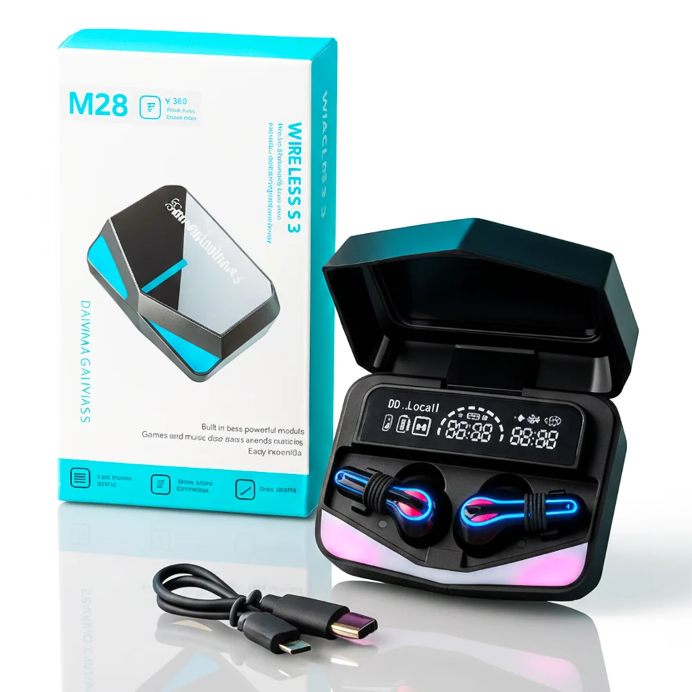 M28 gaming earbuds Pakistan, cheap gaming TWS Pakistan, Bluetooth 5.3 earbuds, M28 TWS price in Pakistan, budget wireless earbuds, gaming earbuds under 2000