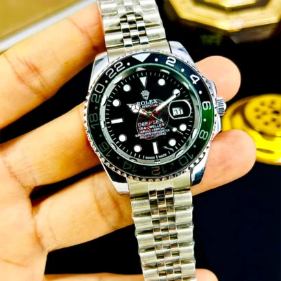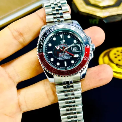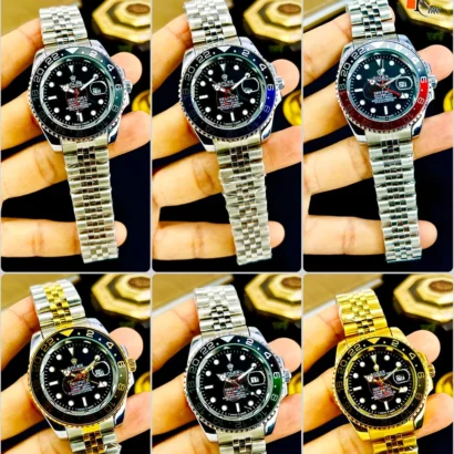 Stylish Rolex GMT men’s watch with stainless steel chain, working date, and multiple color options. Premium look with durable build.