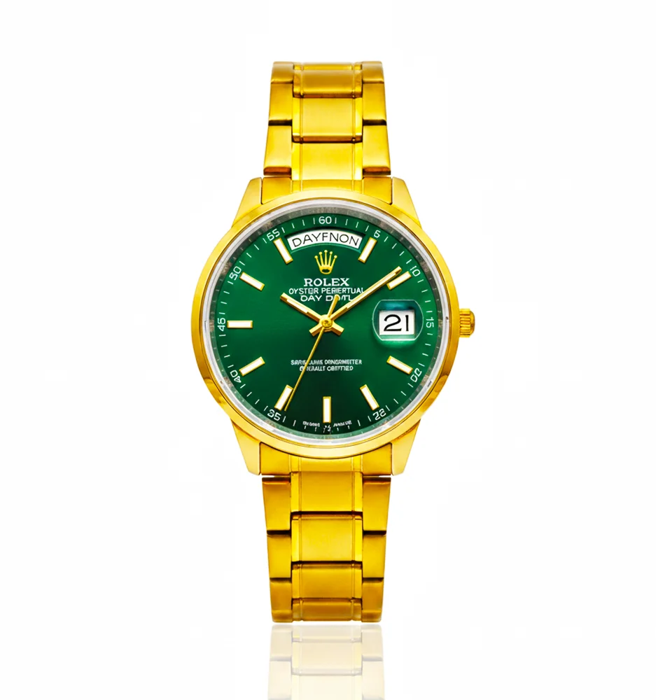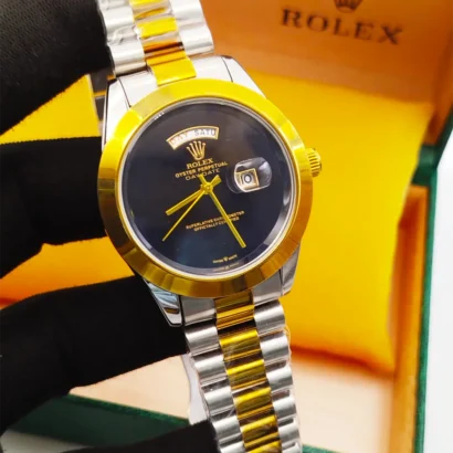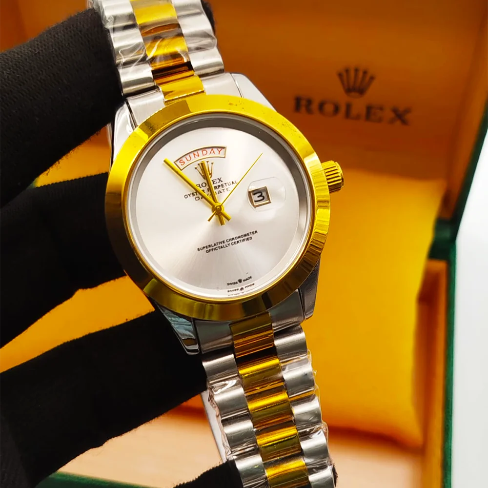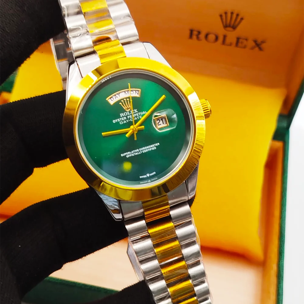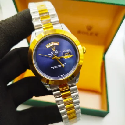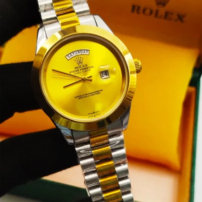 Premium Rolex men’s watch with stainless steel chain, full day & date function, and elegant finishing. Available in multiple colours.