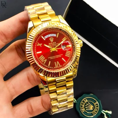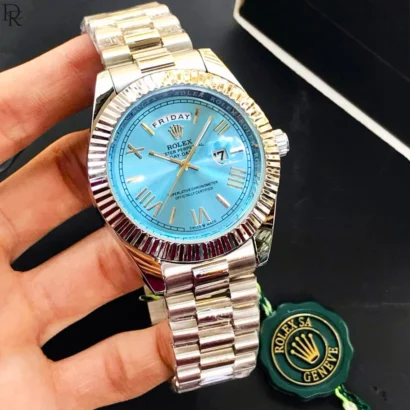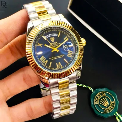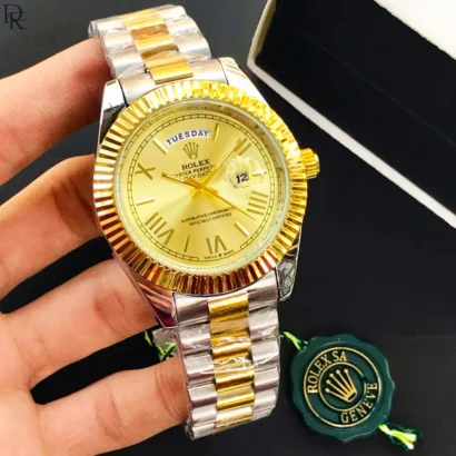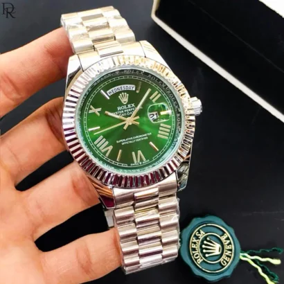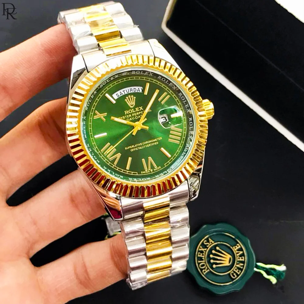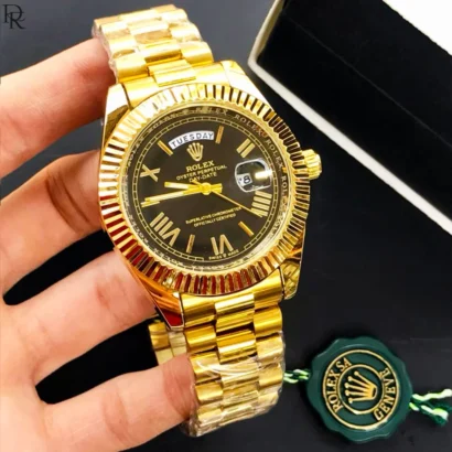 Classic Rolex Roman dial watch with fluted bezel, full day & date function, and heavy premium build. Available in 14 colours.