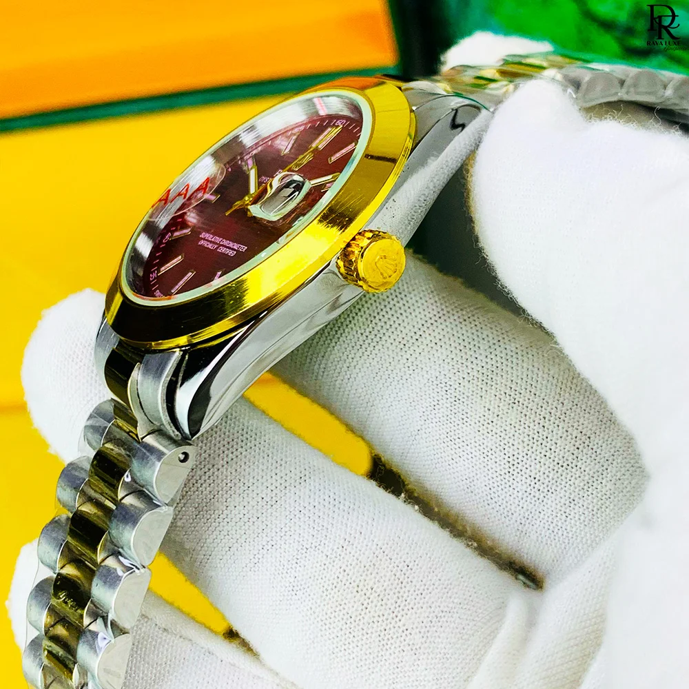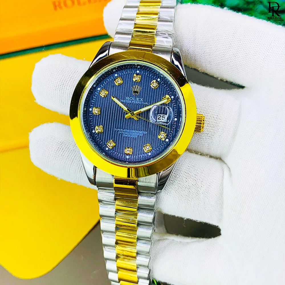 Experience luxury with the Rolex – Swiss Moment Edition. Crafted with Swiss movement precision, this watch delivers reliable performance along with a functional date display. The Taj lock system ensures durability and security, while the range of attractive new colors makes it a stylish choice for every occasion. A perfect balance of elegance, quality, and value – all in one watch.